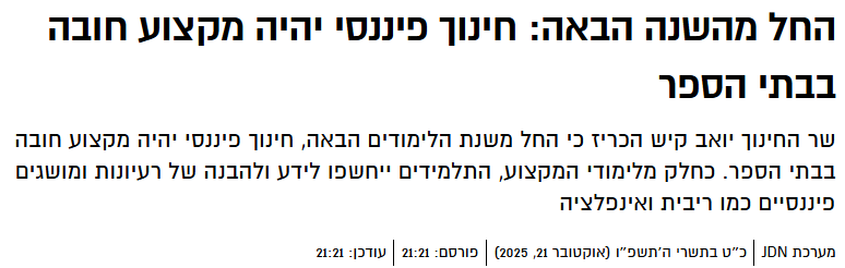 חינוך פיננסי מתחיל בבית אבל הפעם גם במערכת החינוך השבוע פורסם כי החל משנת הלימודים תשפ"ז ייכנס לראשונה חינוך פיננסי כחלק מתוכנית חובה בחטיבת הביניים (כיתות ז'-ט'). התגובות בתקשורת לא איחרו להגיע - ורובן... דווקא חיוביות. "מעולה סוף סוף משהו מועיל!" "הישראלים לא יודעים להתנהל עם כסף - הגיע הזמן ללמד את זה בבית הספר!" "חייבים לימודים פרקטיים - לא רק תיאוריות!" "למה רק שעה בשבוע?" "למה רק מחטיבת הביניים?" אבל בין שלל המחמאות, הייתה תגובה אחת קטנה - שנגעה בדיוק בלב הנושא: "מה זה יעזור אם ההורים קונים לילדים כל מה שהם רוצים?" וזו השורה התחתונה. כי חינוך פיננסי אמיתי - לא מתחיל בכיתה, אלא בבית. הילדים רואים, מחקים ומפנימים את מה שאנחנו עושים. אפשר לדבר על חיסכון, על תקציב, על תכנון אבל אם הם רואים אותנו מושכים, מבזבזים או דוחים טיפול בחשבונות ובחסכונות, המסר כבר נקלט - בלי מילים. בדיוק כמו בתזונה בריאה, אפשר ללמד ילד מה זה ירקות, אבל אם בבית יש בעיקר עוגיות - זה לא יעבוד. אותו דבר בחינוך פיננסי. אם אנחנו לא מנהלים נכון, חוסכים, מתכננים ומתייעצים, הילדים שלנו לא ילמדו לעשות את זה בעצמם.. לכן, לצד היוזמה המבורכת במערכת החינוך, ההמלצה שלי היא שכל זוג, כל משפחה וכל הורה יעבור בעצמו תהליך של התייעלות כלכלית ותכנון פיננסי נכון. להתחיל מוקדם, ללמוד איך לחסוך ולהשקיע, ולטפל כבר עכשיו בכספי הפנסיה והחסכונות. כדי שהדוגמא האישית שלנו תהיה השיעור הכי טוב שהילדים יקבלו. אף פעם לא מאוחר להתחיל - אבל ככל שמקדימים, הרווח גדל. אם עוד לא עשיתם סדר בכספים שלכם - זה הזמן. תיאום פגישה אחת יכולה לפתוח לכם דרך לחיים כלכליים חכמים יותר, ולילדים - דוגמא לחיקוי. לחיות נכון היום- כדי לראות רחוק מחר. [image: 1761559492089-cosmicimg-prod.services.web.outlook.png] הכותבת הינה יועצת פנסיונית מורשית ומתכננת פרישה [image: 1761559534811-%C2%AA.png]