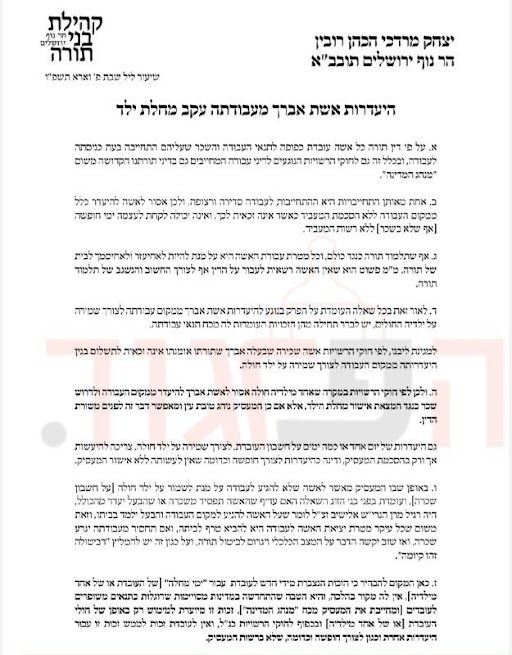 האם זה נכון חוקית? שאסור לאשת אברך להיעדר מעבודה בגין מחלת ילד, אם בעלה אברך.